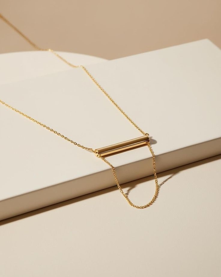 The centerpiece is a smooth, perfectly cylindrical gold bar suspended horizontally on a delicate chain. What sets this design apart is the single, graceful chain drop extending from one side, adding a subtle touch of movement and visual interest.